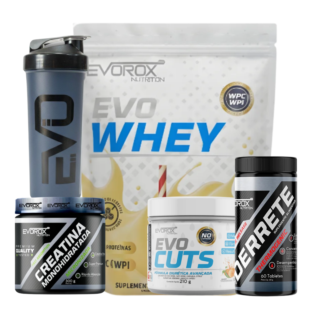 O kit inclui: Creatina Monohidratada Micronizada 300g, Whey Protein 1kg (Refil), Evo Cuts Diurético 300g e Derrete Termogênico 60 tabletes.